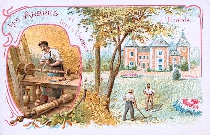 L'érable, de la famille des Sapindacées acérées, est un arbre des régions tempérées. Son bois, très sensible à l'humidité, ne peut être employé pour les grandes constructions, mais il est utilisé pour l'ébénisterie, le tournage, le charronnage, la boissellerie, etc. L'érable, à croissance lente, est employé pour les haies et les palissades. L'érable n'est pas un arbre forestier, on le plante surtout dans les parcs et les avenues. |