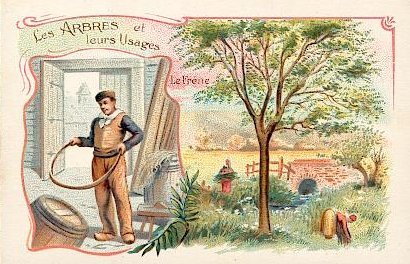 Le frêne, de la famille des Oléacées, est un arbre qui peut s'élever jusqu'à 35 m de hauteur et avoir 3 m de tour, et qui fournit un bois blanc dur et très résistant. Il sert à faire des cercles de tonneaux et de cuves. Les racines et les loupes sont recherchées en ébenisterie fine à cause de leurs veines. Les feuilles sont purgatives et constituent un fourrage sec favorable à la production du lait. |