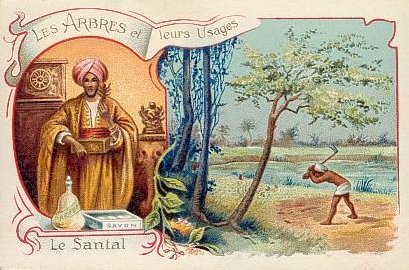 Le Santal est un arbre peu élevé à feuilles opposées. Cette plante vit en parasite, du moins quand elle est jeune, et s'applique sur les racines ou les tiges souterraines des plantes voisines dont elle vit. Il affectionne les limites des champs cultivés et aime à être abrité. On exporte surtout le santal blanc des Indes. Son bois est incorruptible, dur et exhale une odeur très agréable, à cause d'une huile qui s'y trouve et qu'on emploie en parfumerie. De son bois, on fait des petits meubles et des coffrets précieux. |