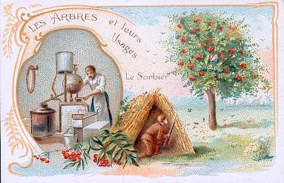 Le sorbier, de la famille des Rosacées est indigène d'Europe, et ne comprend que 3 espèces. Le bois du sorbier sert au montage des outils, les vis de pressoirs, et aussi dans la marqueterie. Des fruits, on tire une boisson alcoolique. Les oiseaux en sont très friands, c'est par bandes qu'ils viennent en automne s'abattre sur les sorbiers, aussi le chasseur en profite-t-il. |