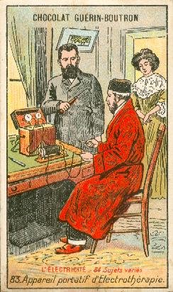 Les chromos pedagos L'Electricité Série du Chocolat Guérin Boutron comprenant 84 sujets sur l'électricité Appareil portatif d'Electrothérapie