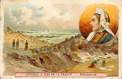 | Penmarck doit son nom, qui signifie tête de cheval, à une pointe rocheuse près de laquelle il est situé et qui a la forme d'une tête de cheval. A la fin du moyen âge, le port de Penmarck armait 700 navires pour pêcher la morue dans les eaux bretonnes. La découverte du banc de Terre Neuve et les ravages du chef de bande Guy de Fontenelle ruinèrent Penmarck au XVIe siècle. Aujourd'hui, c'est une commune du Finistère, port de pêche entouré de dangereux écueils signalés par le phare d'Eckmuhl. Entre la pointe de Penmarck et l'anse de la Torche, la côte est bordée de rochers. Les récifs des Etaux sont les plus importants et offrent une des plus belles horreurs que l'on puisse voir. On ne peut pénétrer dans ces cavernes qu'à marée basse. Nulle partie de la Bretagne ne présente, pendant les gros temps, un aspect plus sauvage. |